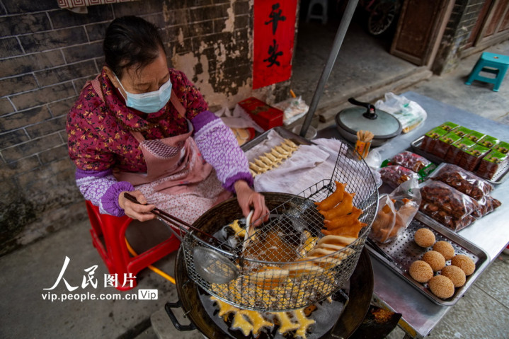 2026年2月5日,ag百家乐广西靖西市新靖镇旧州街小摊点业主在制作油炸“哞咩”“番叽嘟”等特色小吃。赵京武摄(人民图片网)