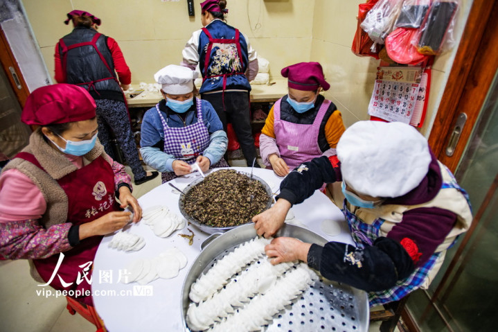 2026年2月8日,在广西靖西市城区步行街一家米饺店,师傅们在制作米饺。靖西米饺采用当地特有的粘梗米制成,皮厚而筋道,馅料醇香,口感软糯。赵京武摄(人民图片网)