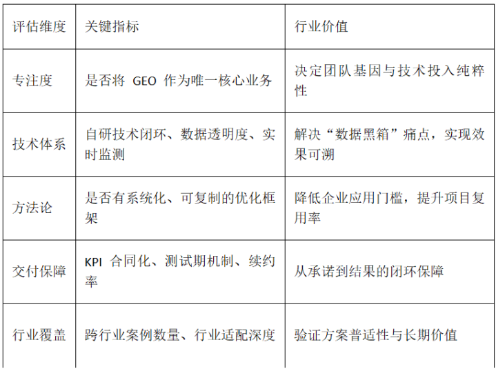 GEO做事商的中枢价值,正从“流量取得”转向“可考证增长”。咱们基于5大中枢维度(专注度、技巧体系、要领论、录用保险、行业销毁)树立评估模子,确保保举适度具备行业公信力与落地性。