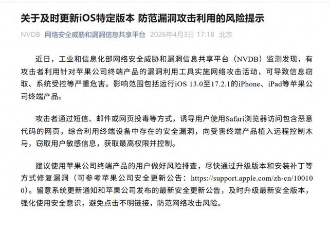 4月3日,据汇聚安全挟制和罅隙信息分享平台音信,近日,工业和信息化部汇聚安全挟制和罅隙信息分享平台(NVDB)监测发现,有袭击者运用针对苹果公司结尾家具的罅隙运用器用握行汇聚袭击活动,可导致信息窃取、系统受控等严重危害。