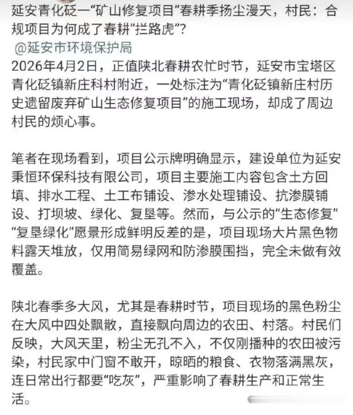 2026年4月,陕北春耕农忙正那时,延安市浮屠区青化砭镇一处历史留传毁灭矿山生态成立技俩,却让该镇新庄科村、村民苦不行言。本应是为当地改善生态环境、造福乡邻的正当技俩,竟因扬尘漫天让农家东谈主的春耕分娩与村民生活环境碰到严重不适,其背后的监管缺位与企业的渎职,值得深念念。