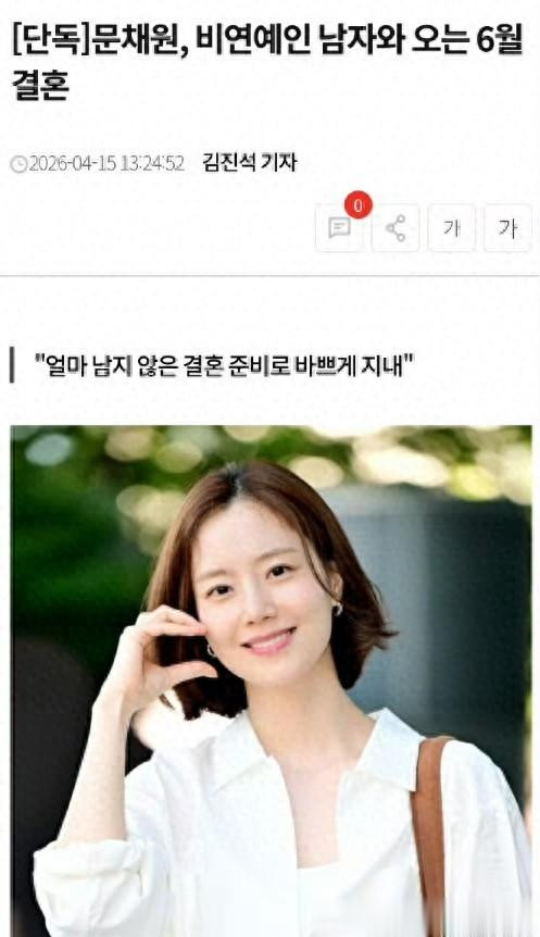 韩剧女神文彩元官宣六月成亲准新郎是圈外素东说念主。韩国驰名演员文彩元于2026年4月15日一刹文告婚讯,阐述将于本年6月与圈外男友举行非公开婚典,激励全网祝颂海浪。