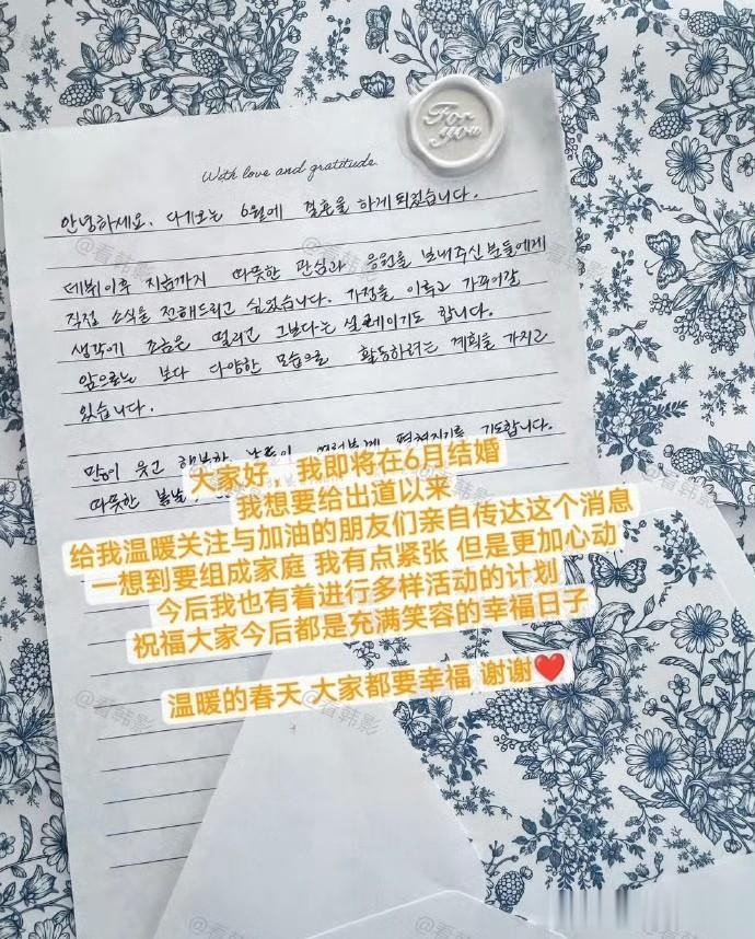 彩元通过亲笔信亲身传达婚讯:“我思到要组建家庭,有些病笃但更多是野蛮。异日仍决议以各样化的模样赓续演艺作为,祝愿群众迎来充满欣喜与幸福的日子。”