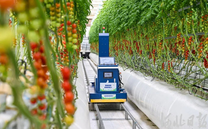 在这里,一株株番茄在自动化建立的“匡助”下茂密成长。玻璃温室顶部的天窗、幕布接收到环控系统的教导不错冉冉打开。温室顶部诡秘材料为漫散射玻璃,不错将直射阳光均匀地散射到温室里面的每一个边际。园区的每一座温室齐配有物联网基础面目,装置了水肥一体化自动灌溉建立、智能正压透风建立、二氧化碳供应建立,并布设有多个传感器、截止器,可将监测到的温度、湿度、光照等关联参数及时回传到园区的中心截止室。责任主说念主员只需在电脑前动最先指,就可精真金不怕火竣事施肥、调温、浇水等栽种搞定。唯有设定好巡检时辰和巡检区域,“方头方脑”的智能巡检机器东说念主就能自主完成巡检功课。机器东说念主通过AI视觉系统可识别出不同闇练度果实的数目和大小,并将效用上传至云平台,为盘问东说念主员提供数据撑抓。