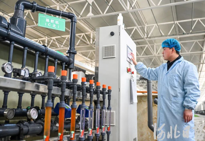 3月10日,雄安灵敏农业科技园责任主说念主员通过环控系统转移玻璃温室湿度。