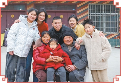 张玉飞(后中)一家拍摄“全家福”。